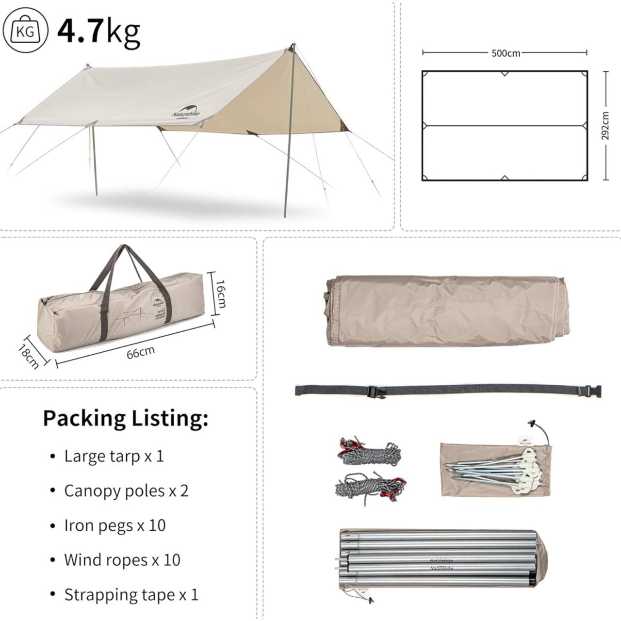 سایبان نیچرهایک (Naturehike canopy) مدل NH16T012-S مدل: NH16T012-S جنس پارچه: پارچه نایلون آکسفورد 150D با لایه نقره ای جنس تیرک ها: گالوانیزه وزن: 2.8 کیلوگرم ابعاد باز شده : 400 ×  350 × 300 سانتی متر ابعاد جمع شده : 13 × 12 × 62 سانتی متر ارتفاع تیرک : 2 متر تعداد تیرک: 2 عدد تعداد طناب: 10 عدد در اندازه های مختلف