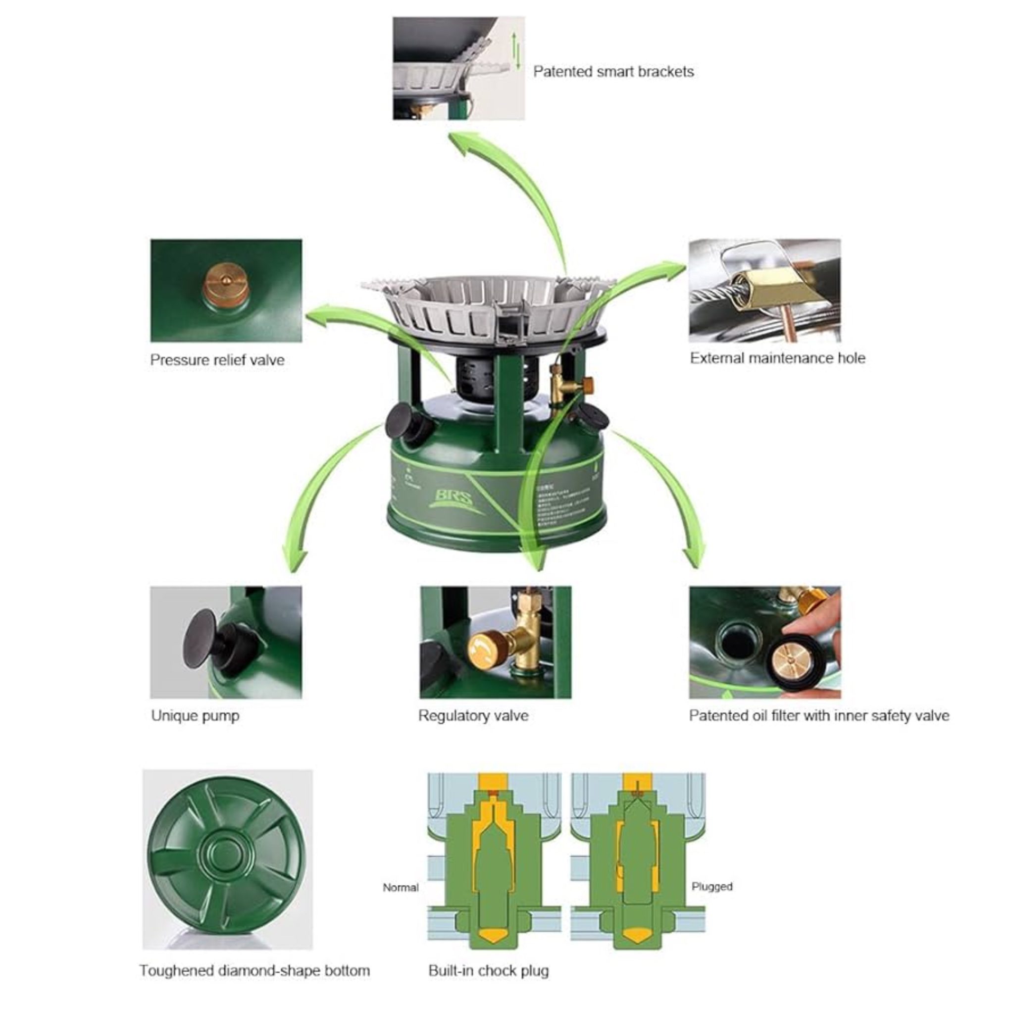 اجاق BRS مدل BRS-16 مدل: BRS-16 توان حرارتی :2650 تا 4700 وات مصرف سوخت: تقریباً 140–160 گرم گاز در ساعت سیستم احتراق: جرقه‌زن نوع سوخت: گاز بوتان، پروپان، LPG شعله: شعله‌ی متمرکز، پایدار، با پخش حرارت یکنواخت متریال اصلی: ترکیب آلیاژ آلومینیوم سبک + فولاد ضدزنگ مقاوم در برابر حرارت مقاومت فیزیکی: مقاوم در برابر ضربه، حرارت بالا و سایش ابعاد در حالت باز: حدود 20 × 28 × 56 سانتی‌متر ابعاد در حالت جمع: حدود 17.5 × 24.5 × 42 سانتی‌متر وزن خالص: حدود 7 کیلو گرم