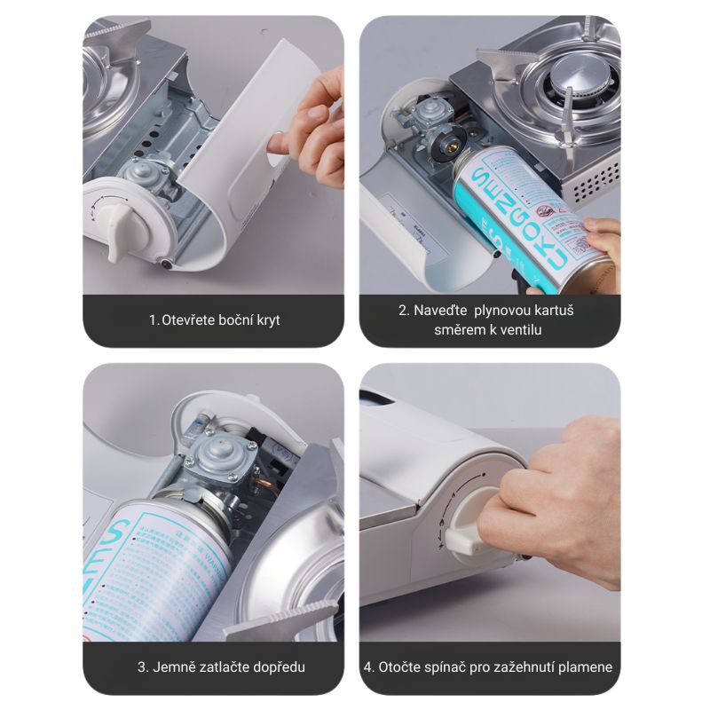 - نحوه عملکرد: نصب کپسول، تنظیم شعله، روشن با فندک، کنترل حرارت