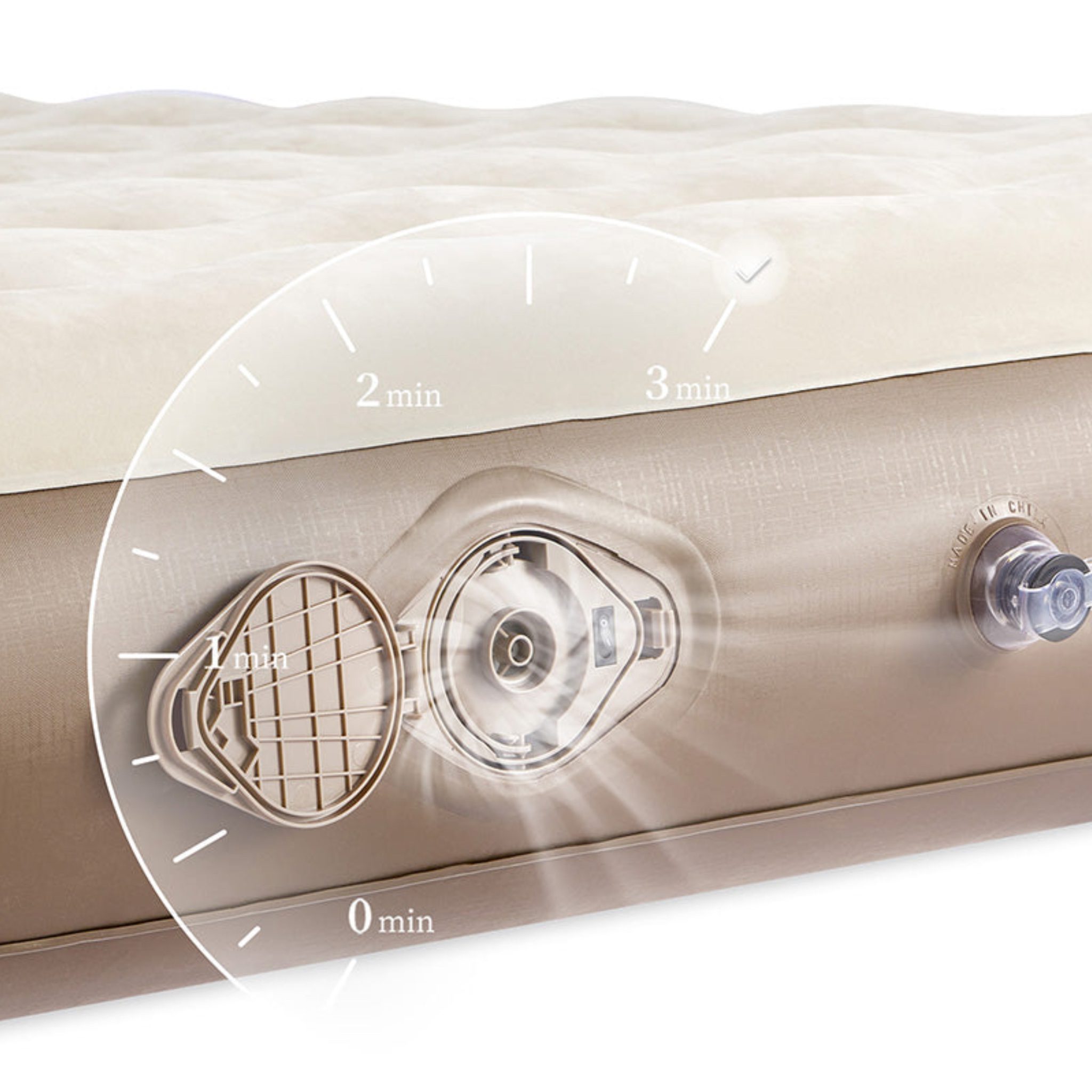 همانطور که در بالا ذکر شد، این محصول مجهز به پمپ داخلی برقی USB با باتری لیتیومی است که فرآیند باد کردن و خالی کردن هوا را به شکل سریع و آسان امکانپذیر میسازد. این پمپ قدرتمند با ظرفیت باتری داخلی 2000 میلیآمپر قادر است تشک را در حدود 3 دقیقه به طور کامل باد کند و همچنین با استفاده از نازل دوگانه، خالی کردن هوا نیز به همان سرعت انجام میشود.