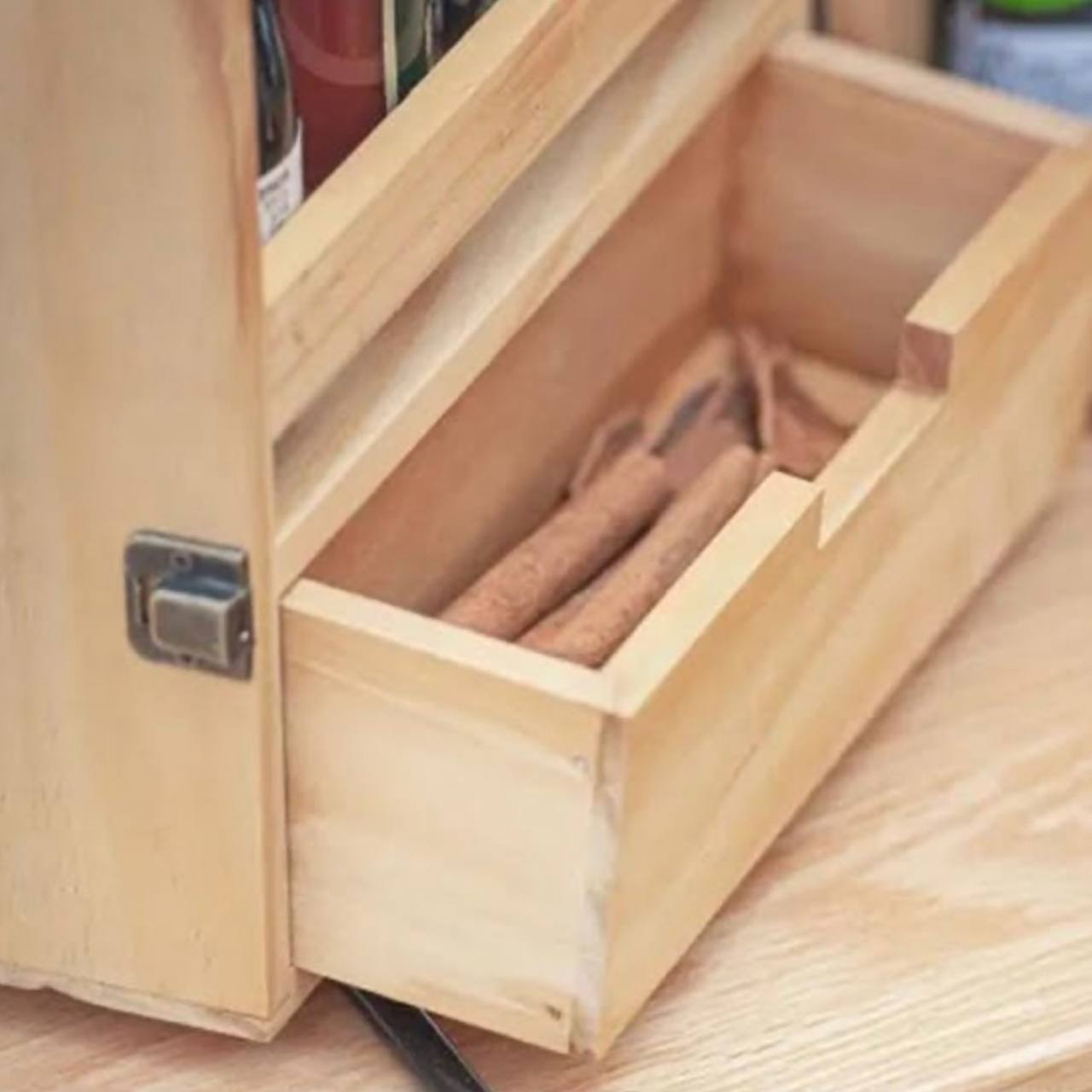 - طراحی چندلایه – نظم و ترتیب در اوج زیبایی: یکی از مهمترین ویژگیهای این کابینت کوچک، طراحی چندلایه و کاربردی آن است. این محصول دارای دو طبقه مجزا برای قرار دادن انواع شیشههای ادویه و یک کشو برای نگهداری وسایل کوچکی مانند قاشقهای اندازهگیری، چاقوهای کوچک یا حتی چای و قهوه است. این نظم فوقالعاده باعث میشود هر چیزی که نیاز دارید در کمترین زمان در دسترس شما باشد.