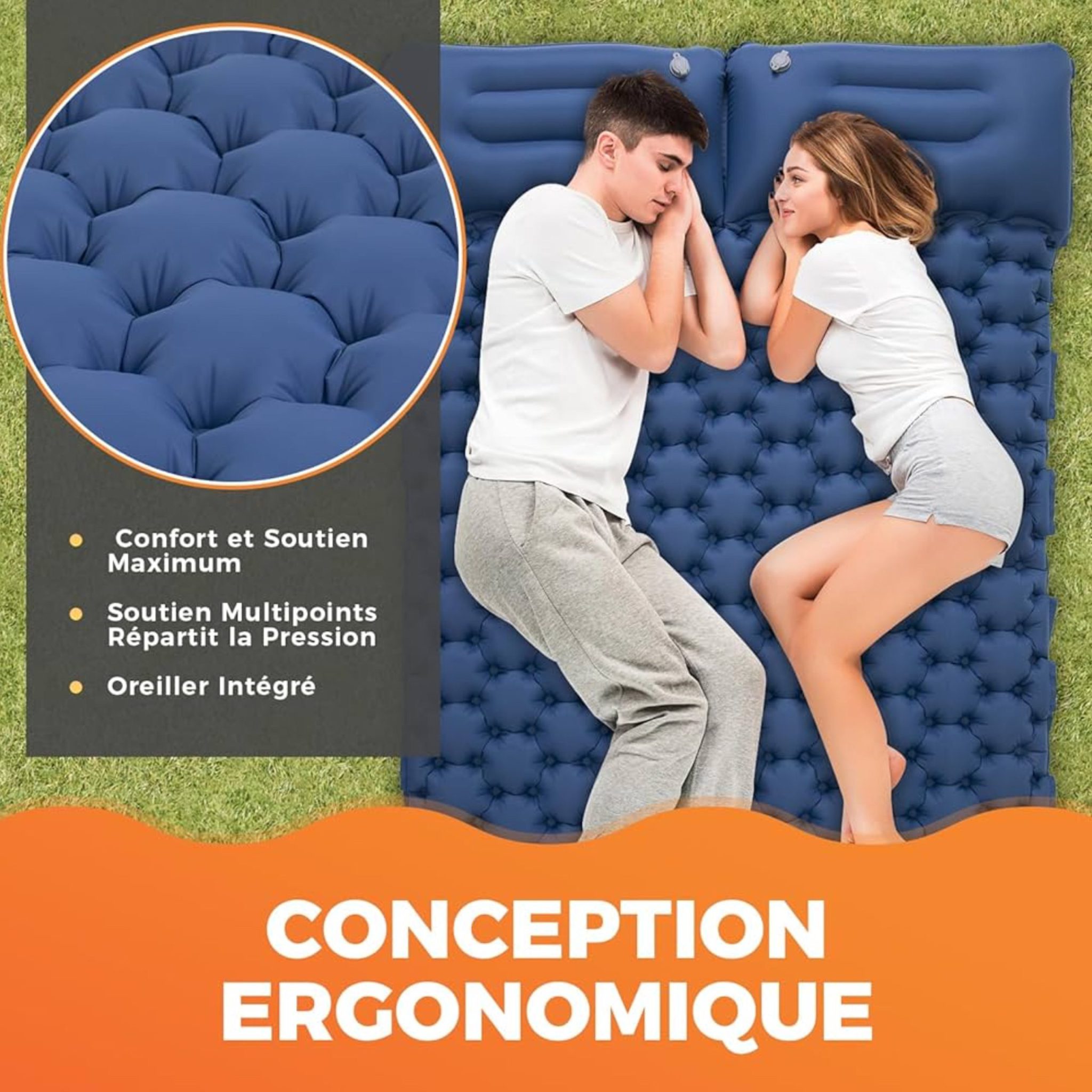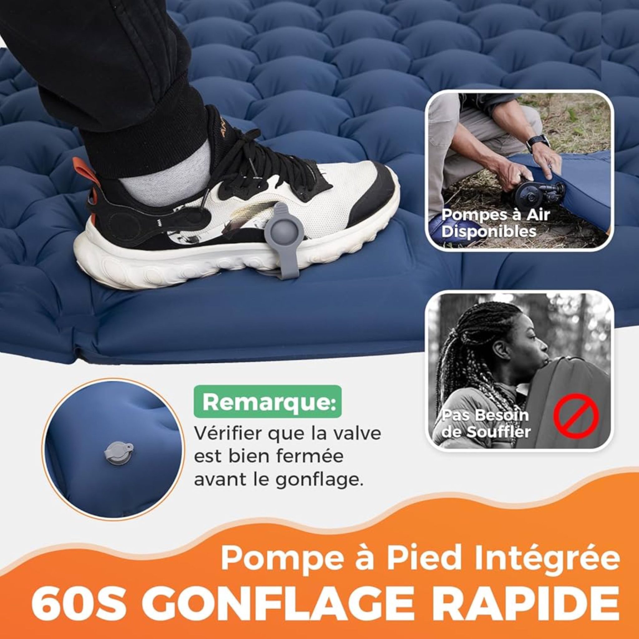 تنها با چند فشار پا، تشک ظرف مدت کوتاهی آمادهی استفاده میشود و زحمت پمپهای دستی یا برقی را به فراموشی میسپارد. طراحی ارگونومیک با طرح موجدار (Ripple Design) باعث توزیع یکنواخت فشار در تمام نقاط تماس بدن با سطح تشک میشود و از ایجاد نقاط فشار جلوگیری میکند.