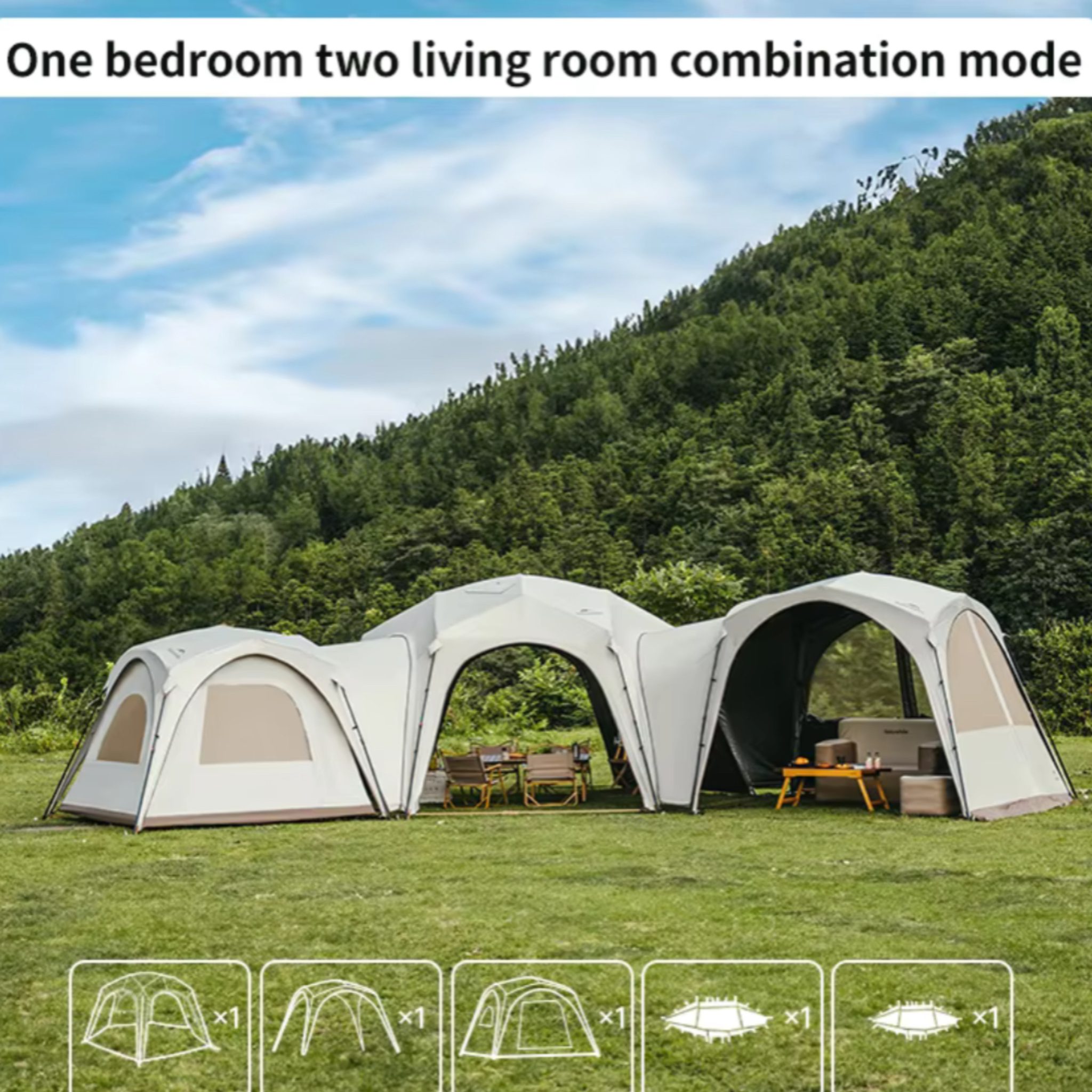 - حالتهای چادر: 1. سقف کامل (Full Opening Canopy) برای فصلهای گرم و مهمانیها 2. نیمه باز (Half Opening Canopy) برای سایه و تهویه (شامل محصول نیست و باید به صورت جدا تهیه شود) 3. بسته کامل (Full Closing Camping Tent) برای شب و هوای سرد (شامل محصول نیست و باید به صورت جدا تهیه شود)