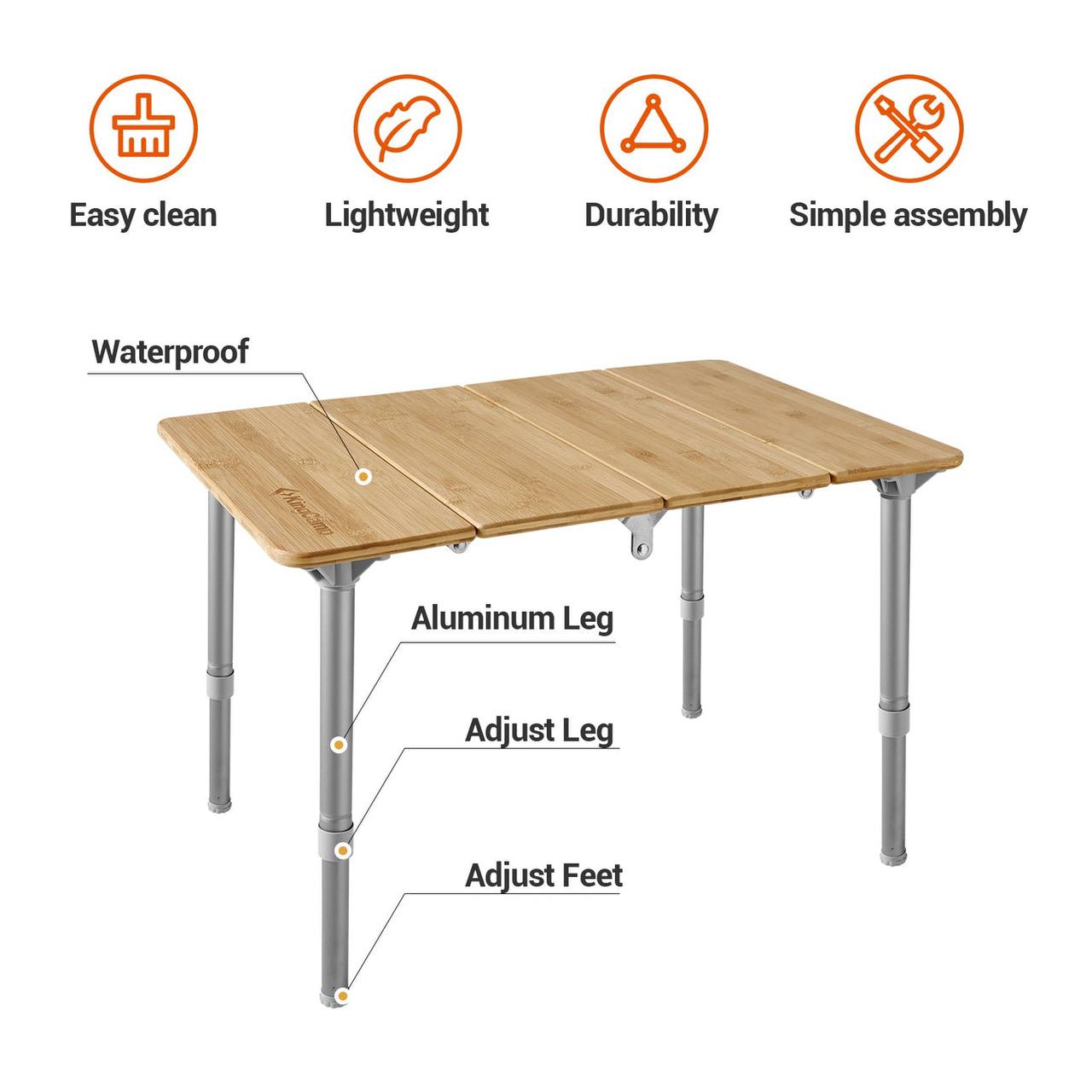 - سبک، قابل حمل و تاشو: یکی از ویژگیهای خاص این میز، طراحی تاشو چهار قسمتی آن است که به راحتی در کیفی کوچک با ابعاد 40 × 14 × 12 سانتیمتر جمع میشود. وزن تنها 3.2 کیلوگرم، آن را به یکی از سبکترین میزهای کمپینگ در نوع خود تبدیل کرده است. بهسادگی میتوانید آن را مانند یک چمدان دستی حمل کرده و در صندوق خودرو یا حتی در کولهپشتیتان جای دهید.