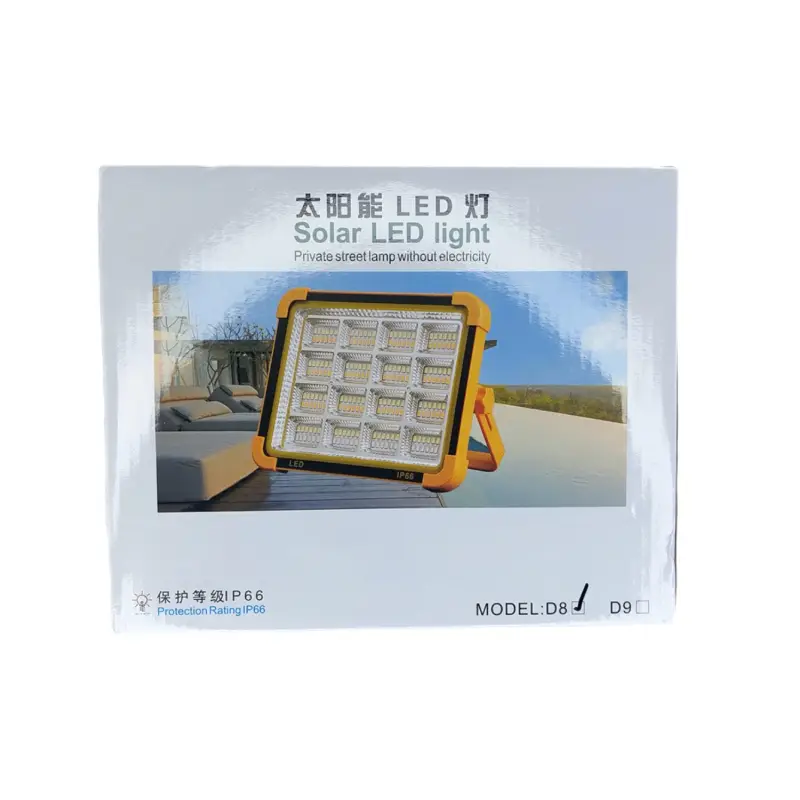 پروژکتور شارژی خورشیدی زینگارو مدل D9 مدل: D9 جنس بدنه: ABS فشرده + آلومینیوم + پلی‌کربنات (PC) تعداد لامپ‌ها: 192 عدد میزان روشنایی (لومن): حدود 1000 لومن برد نور: تا 150 متر تعداد حالت‌های نوری: 5 حالت ظرفیت باتری (مدل 4 باتری): 12000 میلی‌آمپر ساعت ظرفیت باتری (مدل 7 باتری): 16800 میلی‌آمپر ساعت