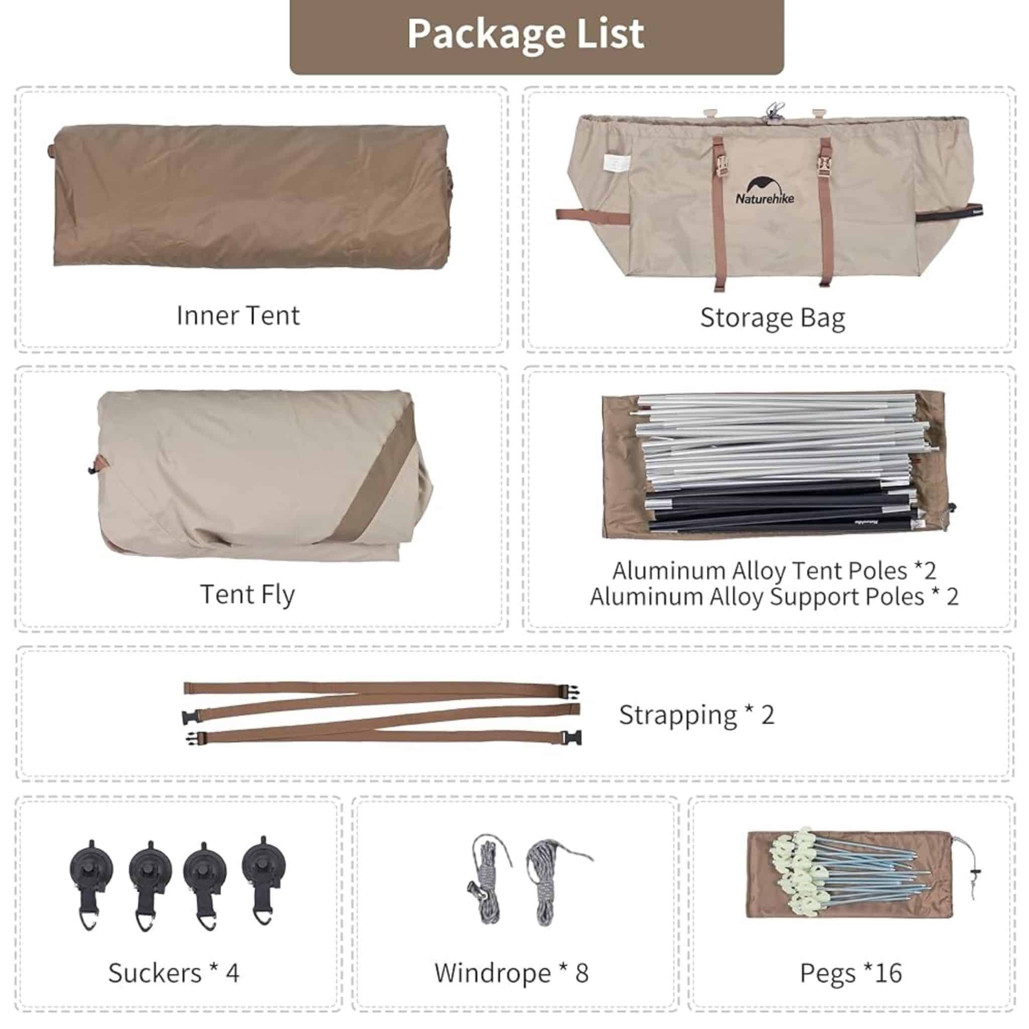 - موارد همراه در بستهبندی: چادر داخلی، چادر بیرونی، طناب مهاربندی ×۸، مکنده (suction cup) ×۴، میخ زدن ×۱۶، تیرک آلومینیومی ×۴، پایه نگهدارنده ×۲، کیف حمل، بند بستهبندی