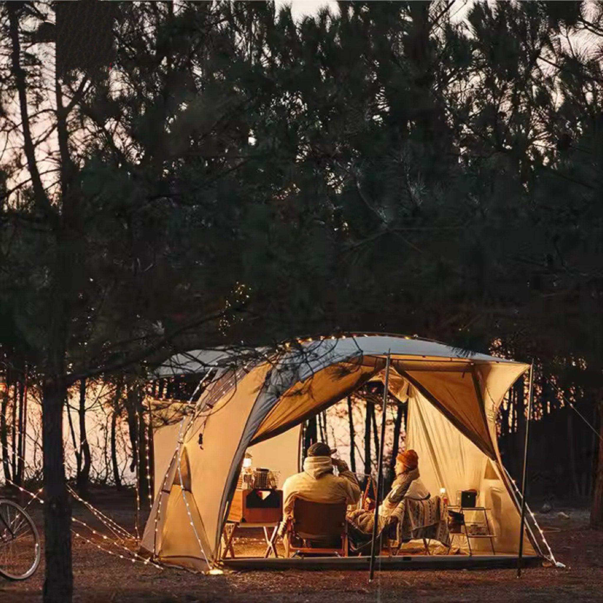 طراحی دو لایه چادر، امکان تهویه مؤثر و جریان هوا را در تمام طول شبانهروز تضمین میکند و تجربهای راحت و دلپذیر در داخل چادر رقم میزند. ظاهر چادر با سایهبان بزرگ و خطوط منظم و مستطیلی نهتنها جلوهای مدرن و شیک دارد، بلکه فضای داخلی را به شکلی کاربردی تقسیمبندی میکند.