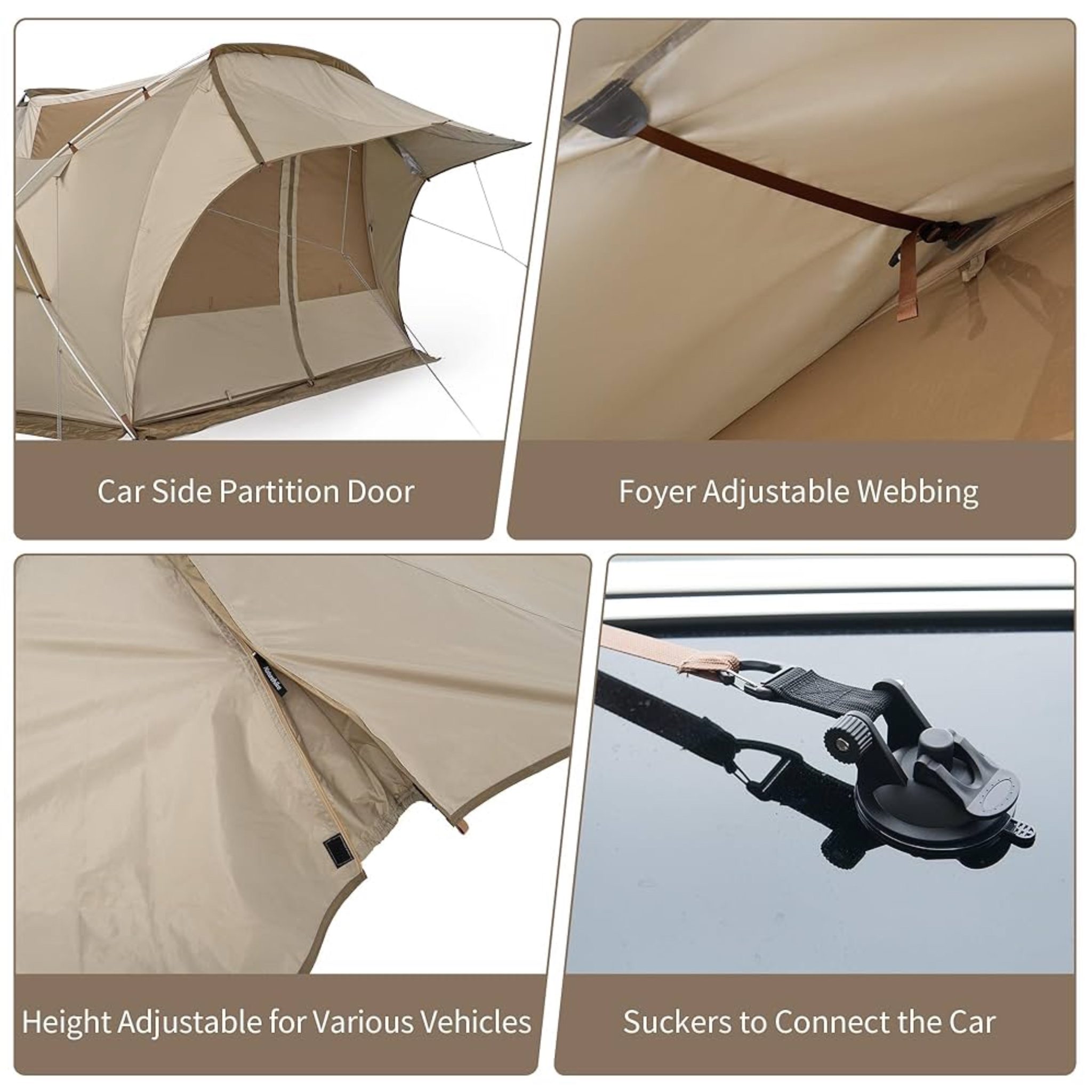 ارتفاع داخلی ۲.۱۵ متر امکان ایستادن راحت داخل چادر را فراهم میکند و حس آزادی و راحتی را افزایش میدهد. چادر قابلیت نصب سریع و آسان دارد و میتواند به صورت مستقل یا متصل به خودرو استفاده شود. سیستم اتصال جانبی با پایه و مکنده، سازگار با انواع SUV، کراساور، ون، استیشن و وانت با سقف سخت یا کفی بستهاست. این طراحی انعطافپذیر، آزادی عمل بالایی برای انتخاب محل کمپینگ فراهم میکند.