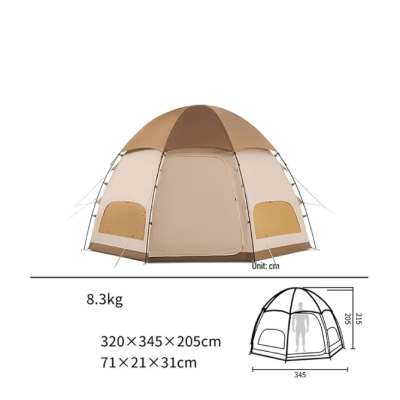 چادر هشت ضلعی 3-4 نفره نیچرهایک مدل NH22ZP012 با طراحی هشت ضلعی به سبک یورت، فضایی حدود ۱.۵ برابر بیشتر از چادرهای معمولی ۴ نفره ارائه میدهد و امکان استفاده چندمنظوره و راحتی حرکت داخل چادر را فراهم میکند. مساحت داخلی ۱۱ متر مربع برای ۳ تا ۴ نفر ایدهآل است و فضای کافی برای خانوادهها و گروههای کوچک دارد.