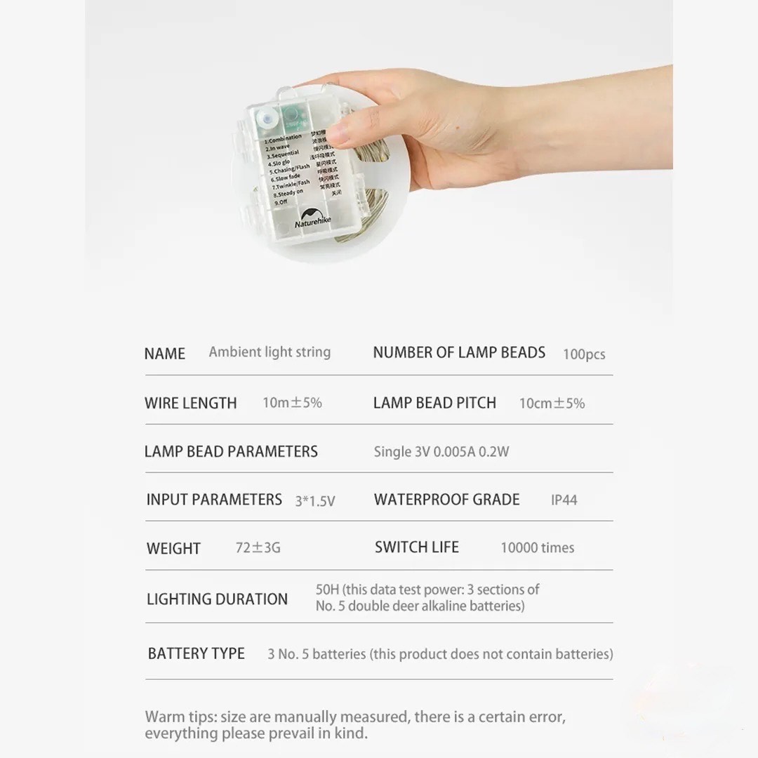 چراغ ریسه‌ای Naturehike مدل CNH22DQ019 ترکیبی از زیبایی، کارایی و دوام است که با طراحی سبک و کم‌مصرف خود تجربه‌ای متفاوت از روشنایی را در سفر و زندگی روزمره ایجاد می‌کند. این ریسه با داشتن ۱۰۰ چراغ LED کم‌مصرف روی سیمی به طول ۱۰ متر، نوری ملایم و یکنواخت پخش می‌کند که هم محیط را روشن می‌سازد و هم فضایی دلنشین و آرامش‌بخش به وجود می‌آورد.