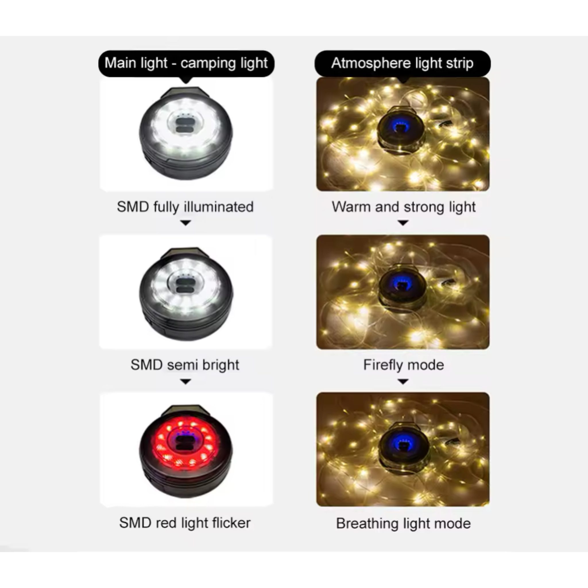 - چندمنظوره: ترکیب چراغ کمپ، چراغ اضطراری، چراغ قوه، نور تزئینی RGB، چراغ آویز، چراغ سیگنال خطر