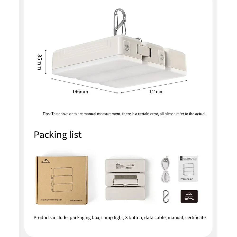 چراغ آویز چادر نیچرهایک مدل NH18Y001-A مدل: NH18Y001-A ابعاد فیزیکی: 86 × 86 × 26 میلی‌متر وزن خالص: حدود 235 گرم جنس بدنه: پلاستیک مهندسی‌شده ABS + PC نوع منبع نور: LED با سیستم نوردهی Modune چندبخشی حداکثر شدت نور: 1300 لومن تعداد حالت نوردهی: 4 حالت محدوده پوشش نوری: چادرهای 2 تا 6 نفره ظرفیت باتری: 9000 میلی‌آمپر ساعت طول عمر باتری با حداکثر روشنایی : 7 تا 9 ساعت طول عمر باتری با حداقل روشنایی : 150-180 ساعت