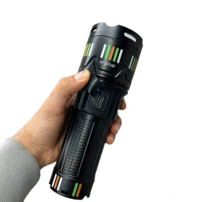 - متریال ساخت: بدنهی این چراغ قوه از آلومینیوم مقاوم ساخته شده که در کنار وزن سبک 520 گرمی، استحکام و مقاومت بالایی را در برابر ضربه و شرایط سخت فراهم میکند. این بدنهی مشکیرنگ با طراحی ارگونومیک و زیبای خود، نهتنها جذاب است، بلکه در دست گرفتن آن حس امنیت و کیفیت را به کاربر منتقل میکند.