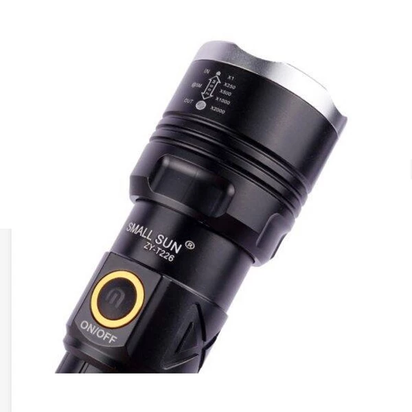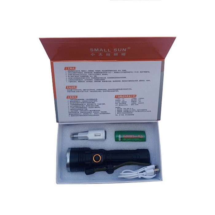 چراغ قوه Small Sun مدل T231 نوع چراغ قوه:چراغ قوه دستی تعداد لامپ:1 عدد رنگ نور:مهتابی میزان روشنایی:6000لومن برد نور:900 متر نوع باتری:لیتیومی حالت نوردهی:3 حالت جنس بدنه:اومینیوم قابلیت ضداب و ضد ضربه:دارد