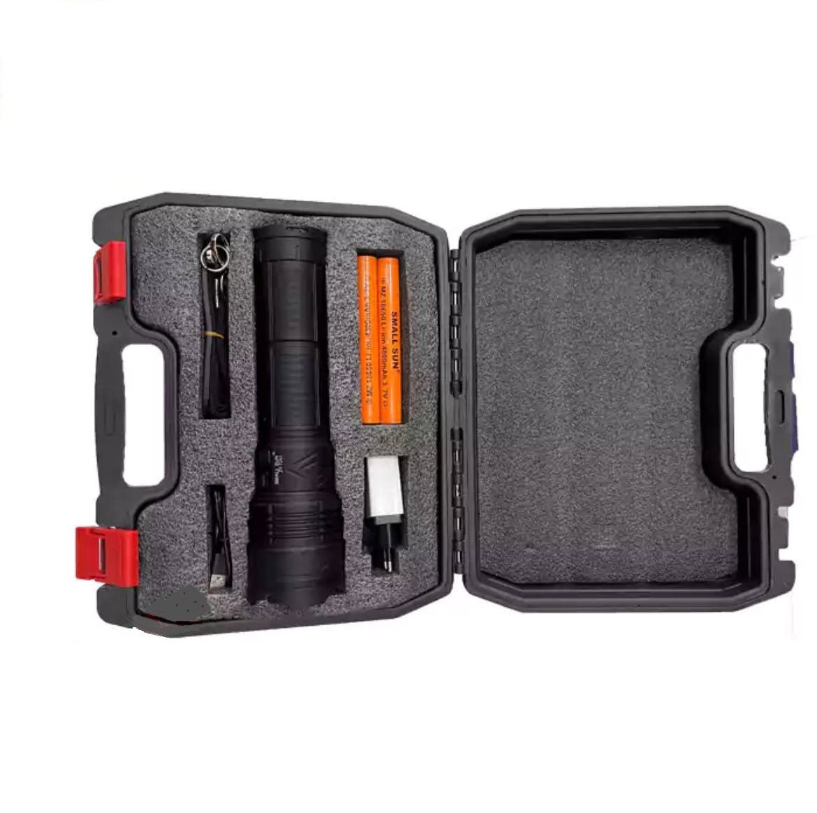 چراغ قوه Small Sun مدل T170 دارای باتری قابل شارژ دارای 4 عدد باتری 2400 میلی امپر مدت زمان نور دهی ان 4 الی 6 ساعت است دارای قابلیت ضد بخار دارای قابلیت ضد اب دارای قابلیت ضد شوک قدرت روشنایی 2000 لومن دارای برد نور 750 متر دارای وزن 900 گرم