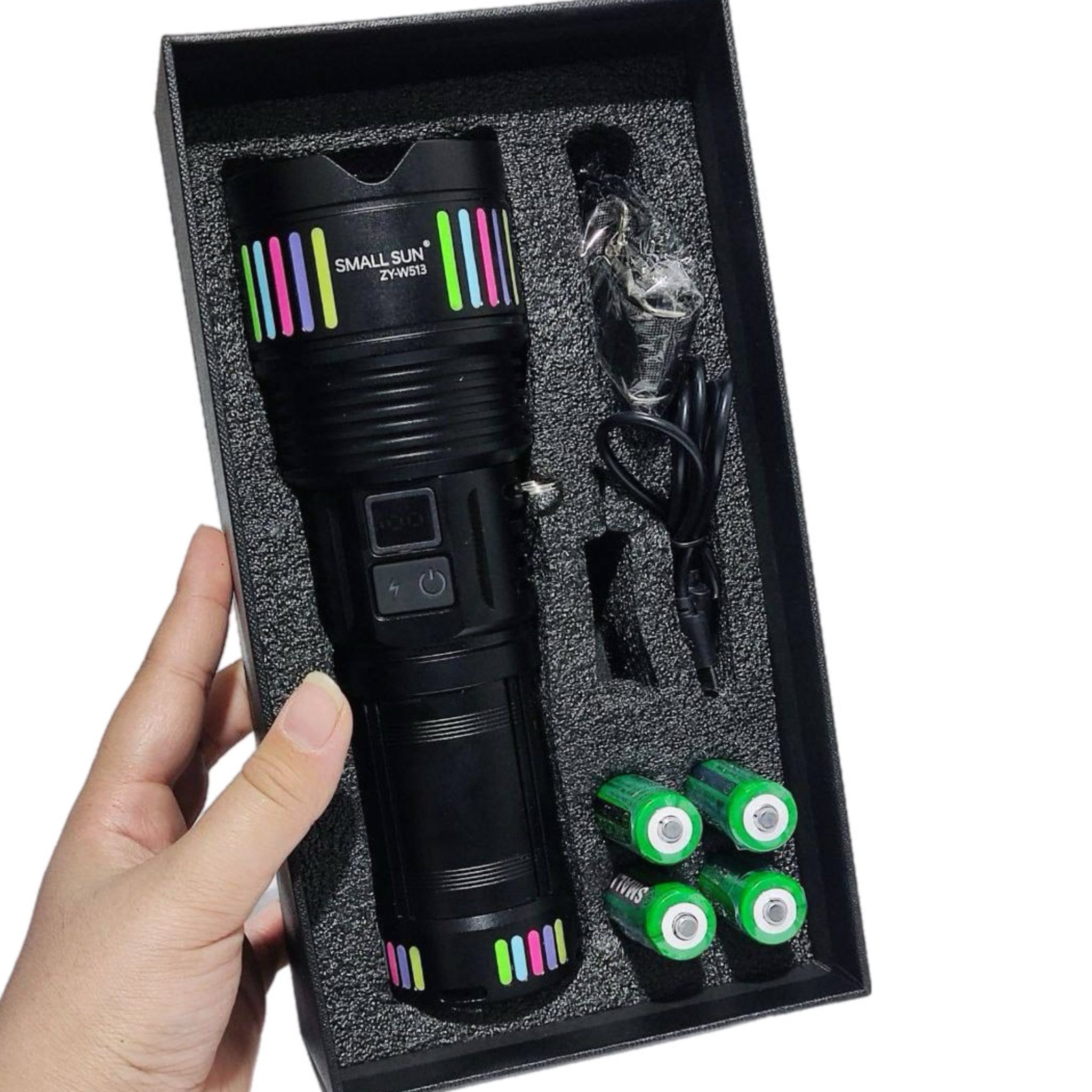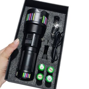 - محتویات بستهبندی: چراغ قوه حرفهای، کابل شارژ USB-C، آداپتور شارژ 5 ولت 2 آمپر، 4 عدد باتری لیتیومی 18650 با ظرفیت 3500mAh، بند حمل دستی