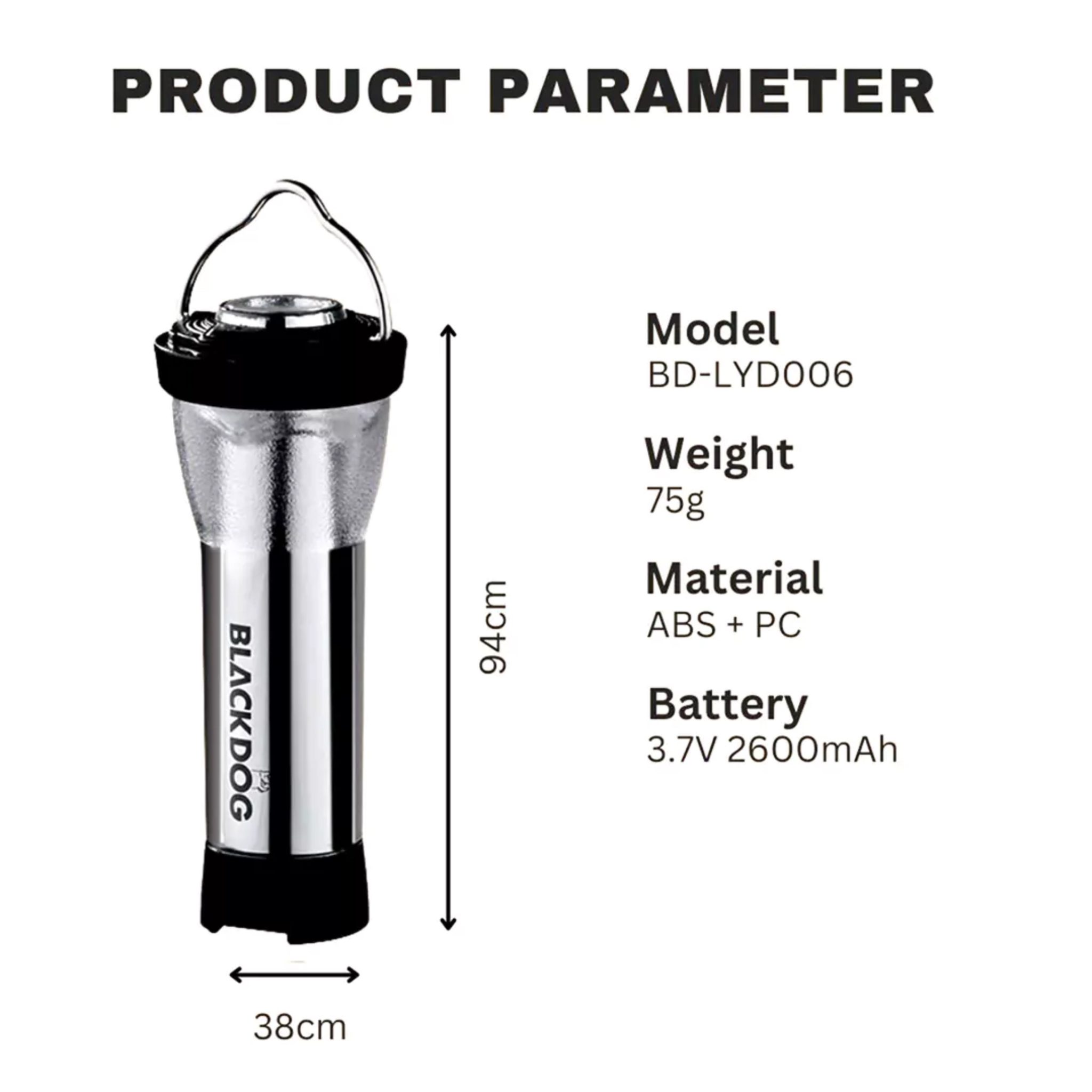 چراغ آویز کمپینگ رترو بلک داگ مدل BD-LYD010 مدل: BD-LYD010 طراحی ظاهری: سبک رترو (قدیمی و نوستالژیک) جنس بدنه: پلاستیک مقاوم ABS، پلی‌کربنات (PC) و فریم فلزی منبع نور لامپ: LED با بهره‌وری بالا و مصرف کم انرژی دمای رنگ: نور ۲۷۰۰ کلوین (نور زرد گرم و ملایم) شدت روشنایی (لومن): قابل تنظیم در سه سطح ۳۰، ۶۰ و ۱۲۰ لومن نوع باتری: سلول لیتیومی ۱۸۶۵۰ با ظرفیت ۴۰۰۰ میلی‌آمپر ساعت مدت زمان استفاده مداوم: ۱۲ تا ۴۰ ساعت
