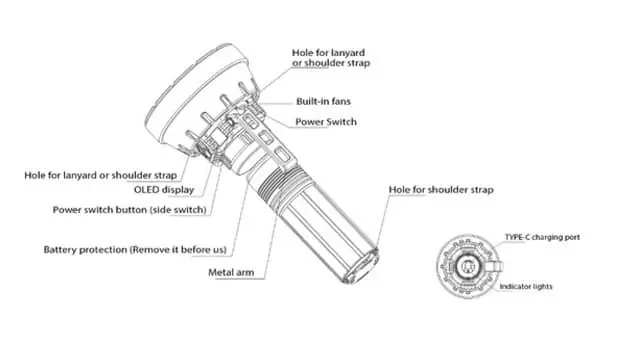 این چراغ قوه دارای یک باتری 32 میلی امپر ساعتی است که توسط یک شارژر PD100W شارژ می شود.این شارژر فست بوده و در مدت 90 دقیقه باتری به طور کامل شارژ می شود.این محصول به USB-C مجهز بوده و دارای سیستم خنک کننده نیز است.این سسیتم جهت ایمنی و دفع حرارت دستگاه و شارژ سریع طراحی شده است.