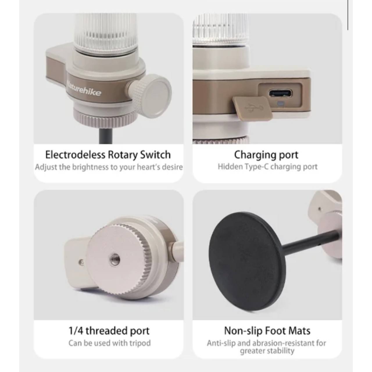 - طراحی جمع و جور و قابل حمل: با ابعاد 4.5 × 8.4 × 16.2 سانتیمتر بدون پایه و 7 × 8.4 × 26.8 سانتیمتر با پایه، این چراغ کاملاً مناسب حمل در سفرها و کمپینگهاست. این ابعاد باعث میشود که به راحتی در هر کولهپشتی یا جعبهای جا بگیرد. همچنین یک کیف ذخیرهسازی همراه آن است که از آسیب دیدن و خط و خش جلوگیری میکند و حمل آن را راحتتر میکند.