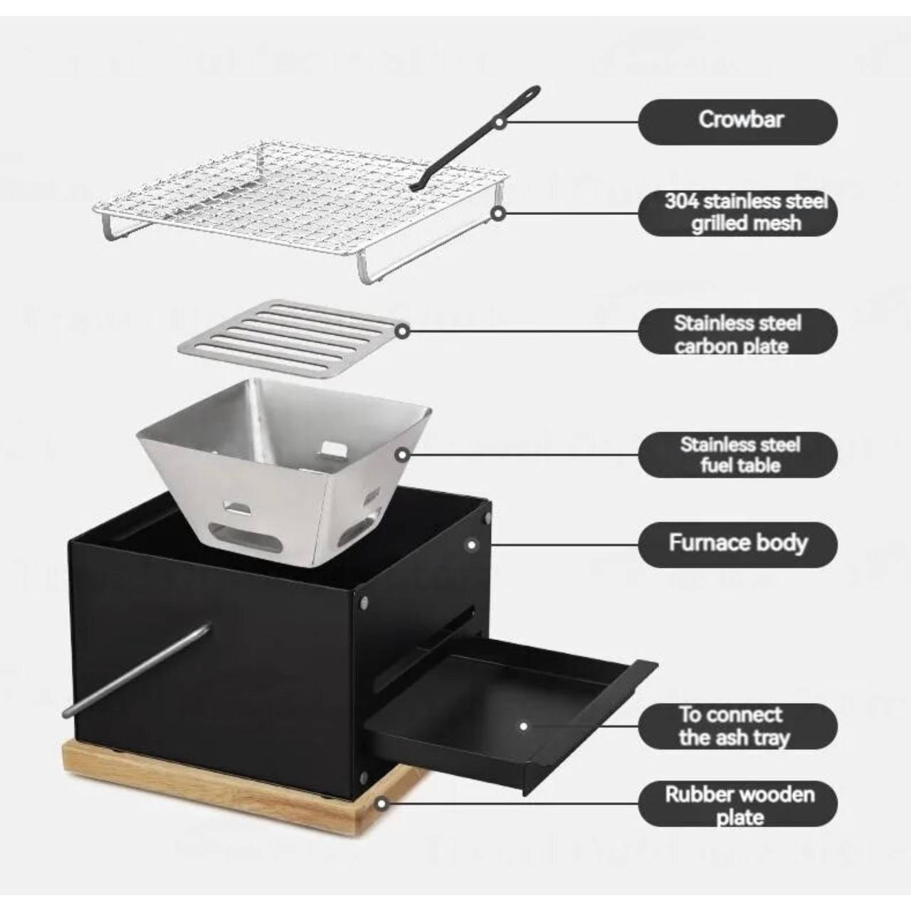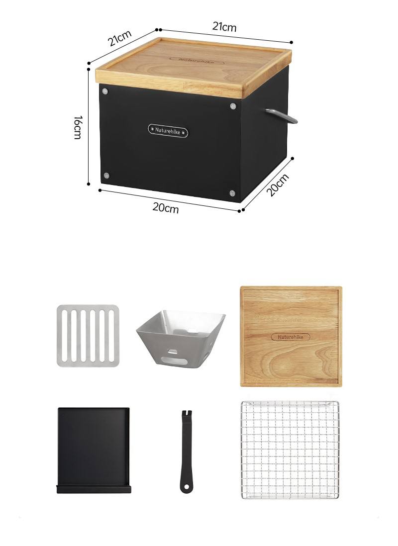 این گریل با تمام ابزارهای موردنیاز عرضه میشود: توری گریل، سینی زغال، پایه سوخت، سینی چوبی، سینی خاکستر و یک اهرم مخصوص برای جابجایی قطعات داغ.