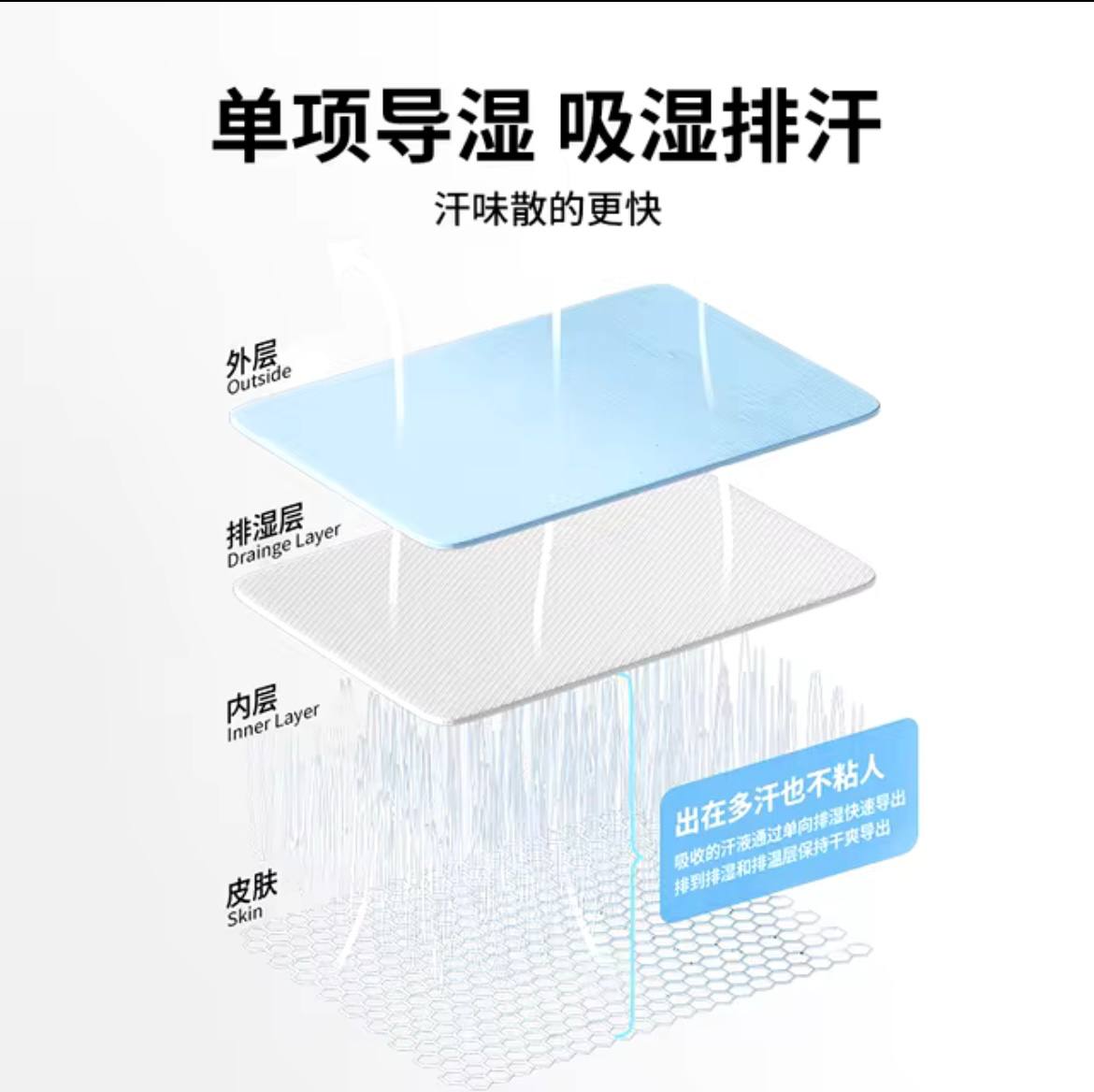 – این بیس لایر از ترکیب پارچههای مصنوعی و تنفسپذیر ساخته شده است که به کاربر اجازه میدهد تا در هنگام فعالیتهای بدنی سنگین، رطوبت بدن به سرعت دفع شود و بدن کاملا خشک مس ماند. این خاصیت ضد تعریق مانع از خیس شدن و سرد شدن بدن میشود. پارچه به کار رفته در این بیس لایر ترکیب پلیاستر و اسپندکس می باشد که علاوه بر سبک بودن، قابلیت کشسانی بالایی دارد.
