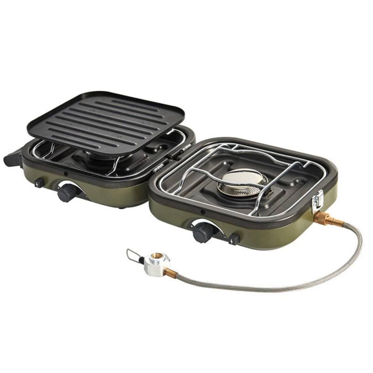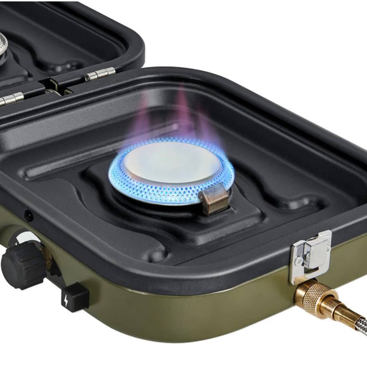 - سیستم دو شعلهی قدرتمند و کارآمد: این مدل مجهز به دو شعلهی مستقل است که هرکدام توان 2300 وات دارند. این توان بالا به شما اجازه میدهد تا غذا را با سرعت و یکنواختی بیشتری بپزید. دو شعلهی جداگانه، امکان استفادهی همزمان از دو قابلمه یا تابه را فراهم میکنند که در سفرهای گروهی بسیار کاربردی است.