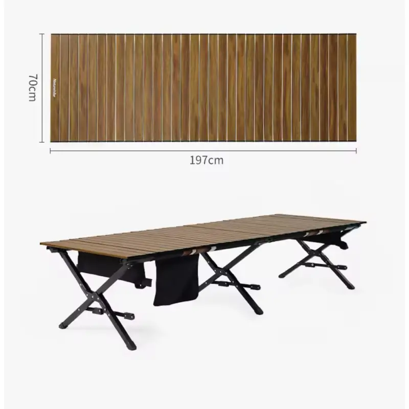 فریم تخت از آلومینیوم مقاوم ساخته شده و ظاهر آن شبیه چوب طراحی شده تا حس گرما و طبیعی بودن محیط را القا کند، پایههای 2.5 سانتیمتری تعادل و پایداری کامل روی سطوح مختلف ایجاد میکنند و توان تحمل وزنی تا 150 کیلوگرم را دارند،. با وجود این استحکام بالا، وزن کل محصول تنها 6 کیلوگرم است تا جابهجایی و حمل آن ساده باشد. طراحی مفصلی و جمعشونده امکان باز و بسته کردن سریع تخت بدون نیاز به ابزار را فراهم میکند و ابعاد جمعشده 98×22 سانتیمتر باعث میشود به راحتی در صندوق خودرو یا کولهپشتی قرار گیرد.