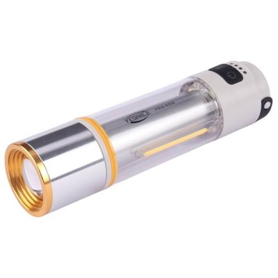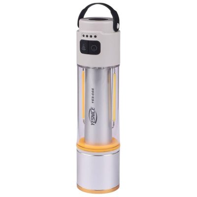 چراغ فانوس شارژی YESNICE مدل 666 مدل: 666 رنگ: سفید جنس بدنه: پلاستیک مقاوم (ABS) قدرت روشنایی: 1000 لومن ابعاد محصول: 19 × 5 × 5 سانتی‌متر وزن: بسیار سبک و قابل حمل طراحی: مجهز به قلاب تاشو برای آویزان کردن در چادر یا تجهیزات کمپ پایه مغناطیسی: دارد نوع باتری: لیتیوم-یون 18650 قابل شارژ تعداد لامپ: یک لامپ اصلی و دو لامپ جانبی حالت‌های نوردهی: 5 حالت مختلف قابلیت تنظیم کانون نور: دارد
